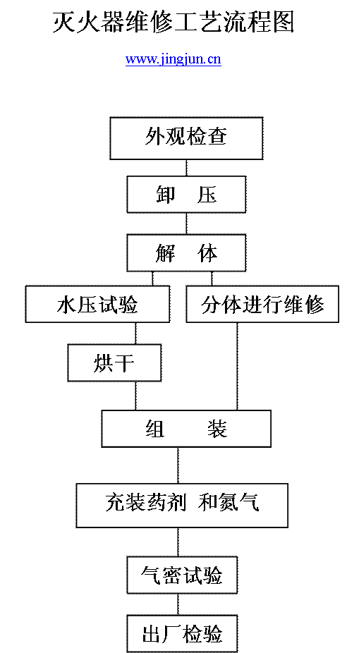外觀檢查--卸壓--解體--水壓試驗(yàn)--分體進(jìn)行維修--筒體烘干--組裝--充裝藥劑、氮?dú)?SPAN lang=EN-US>--氣密試驗(yàn)--出廠檢驗(yàn);維修滅火器(年檢)包括: 1,滅火器檢測(卸壓打開滅火器檢測器頭、閥門、虹吸管、壓力表性能是否正常,并更換損壞的配件);2,滅火器筒體水壓試驗(yàn),測試滅火器筒體在2.5MP的壓力下是否變形報(bào)廢,檢測滅火器筒體是否銹化腐蝕;3,烘干滅火器筒體;4,重新灌裝滅火藥劑并稱重計(jì)量,更換變質(zhì)的滅火藥劑;5,重新充裝驅(qū)動(dòng)氣體氮?dú)鈮海?/SPAN>6,密封器頭后做噴射性能檢查、氣密性能檢查;7,滅火器筒體外部的清潔清洗;8,貼當(dāng)?shù)叵谰终J(rèn)可的 滅火器維修年檢合格證 標(biāo)簽